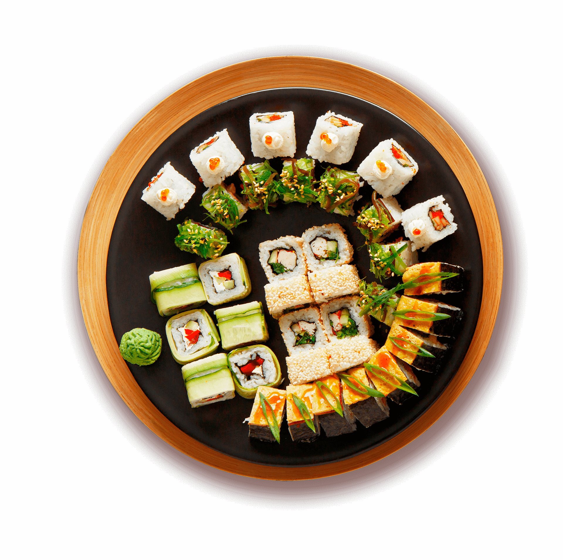 "Европейский", "Тори", "Ти-дзу сурими", "Филадельфия" класическая, "Киото", "Бекон" ролл, "Шахматы", "Лава", "Цезарь", "Крабо маки" (80шт.)